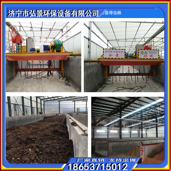 槽式翻粪机发酵槽砖混结构,槽长度建议30~40米、宽2~8米、深2米左右,可以若干个槽并列组合(根据实际情况自行选择,图纸弘景环保厂家免费提供),置于封闭或半封闭的发酵房中。发酵房顶棚采用透光材料,以充分利用太阳能。发酵槽底部埋设通气管,物料填入后采用高压送风装置定时强制通风,以保持槽内通气良好,促进微生物迅速繁殖。